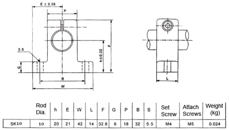 These SK10 Supports are usable with our 10mm Smooth Rods, you can simply slide the rail through and then tighten the clamp screw at the top to fix it in place. Then use our M5 Screws to attach them. If you need to disassemble or otherwise repair your machine, simply open up the clamp and remove the rail.
