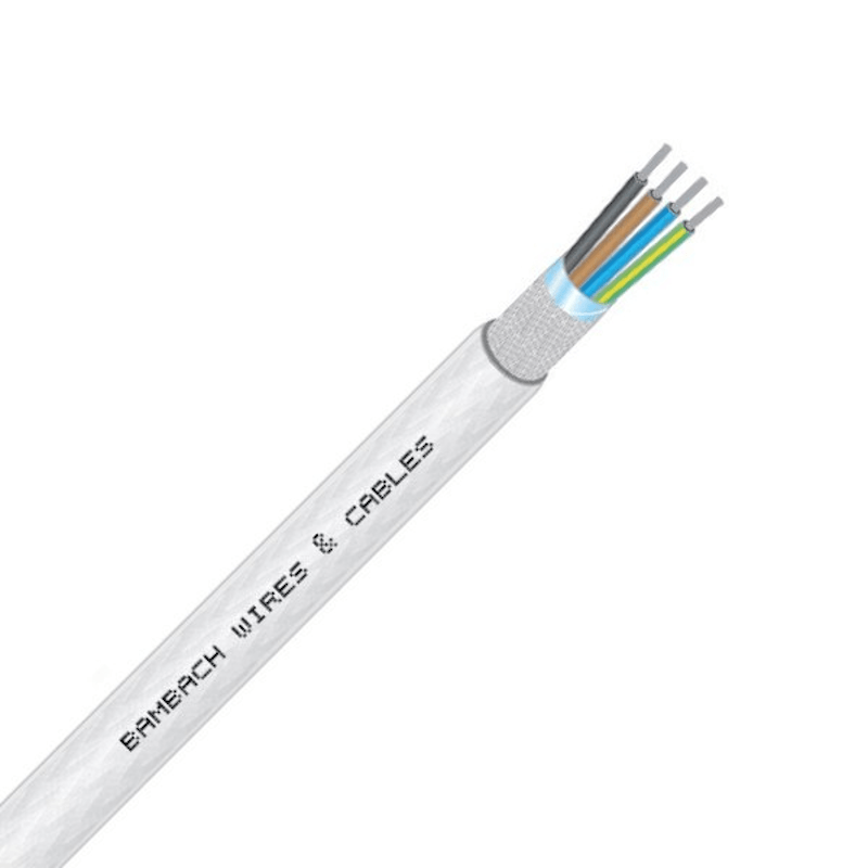 Our oxygen-free tinned annealed copper wires (class 5) are insulated with a colored layer of X-90 XLPE insulation. The four insulated wires are shielded by an oxygen-free tinned annealed copper wire braid, which is covered with Aluminium/PET tape (100% coverage) to shield the cores from EMF interference. This is then insulated with a thick clear layer of 4V75 PVC thermoplastic sheath insulation.