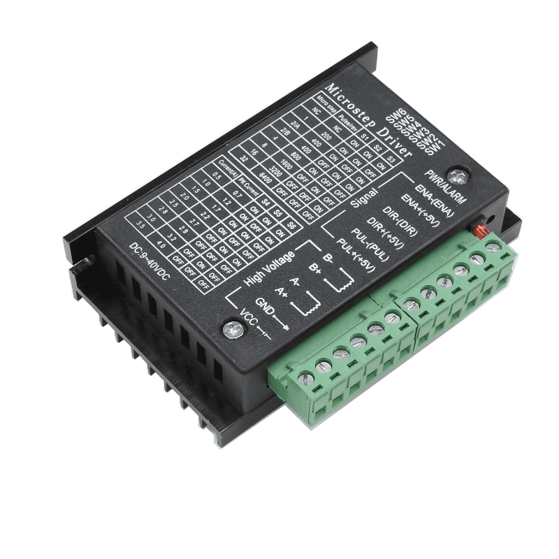 The stepper driver supports speed and direction control. You can set its micro step and output current with 6 DIP switch. All signal terminals adopt high-speed optocoupler isolation, enhancing its anti-high-frequency interference ability.