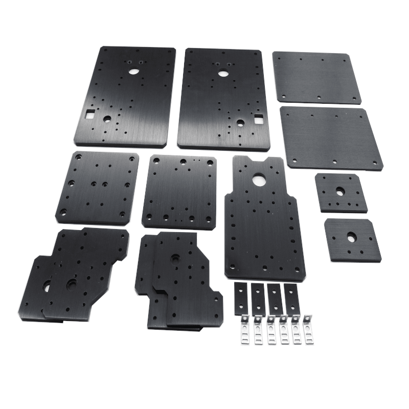 Plates have also been added or modified to completely cover any bare extrusion ends. All the plates supplied with the kit are manufactured from 6061-T5 Aluminium. The plates are then shot blast and anodised in matt black, to give a very clean finish.