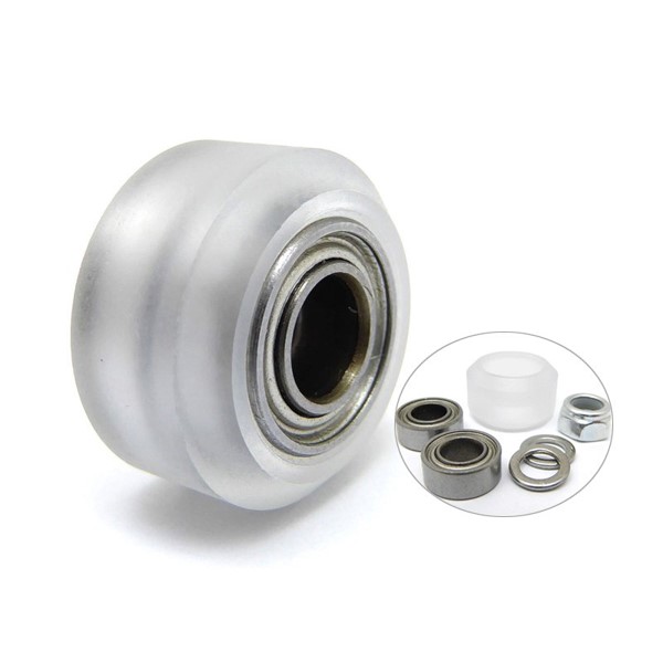 - To assemble, first push one bearing into the wheel. Then using the screw as a guide push one of the two Mini shims and press the 2nd bearing in the wheel.